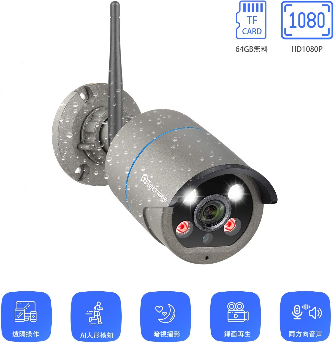 クーポンコード:9JT6UMNJで表記価格になります。スマホからカメラを遠隔操作し、リアルタイムに動画確認が可能です。カメラに内蔵のマイク・スピーカーを使って音声双方向通話も可能な防犯カメラです。無線も有線も接続可・64GBカード付。IP66防水仕様。録画機不要、配線いらず、電源アタプターとコンセントを接続するだけですぐ設置可能。