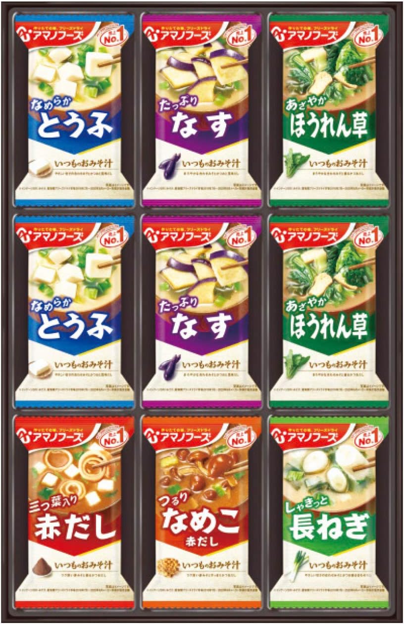 1個あたり63円。アマノフーズのフリーズドライみそ汁はおいしいのでおすすめです。いつものおみそ汁(とうふ・なす・ほうれん草各6個・赤だし・なめこ・長ねぎ各3個)の27食セットです。具材にあわせた“みそ”と“だし”にこだわった自慢のおみそ汁のフリーズドライギフト。いつでもお湯を注ぐだけで、簡単においしいおみそ汁が完成。本格派の味わいを手軽に楽しめます。Amazonプライム会員又は2,000円以上の注文で送料無料。それ以外は送料400円です。