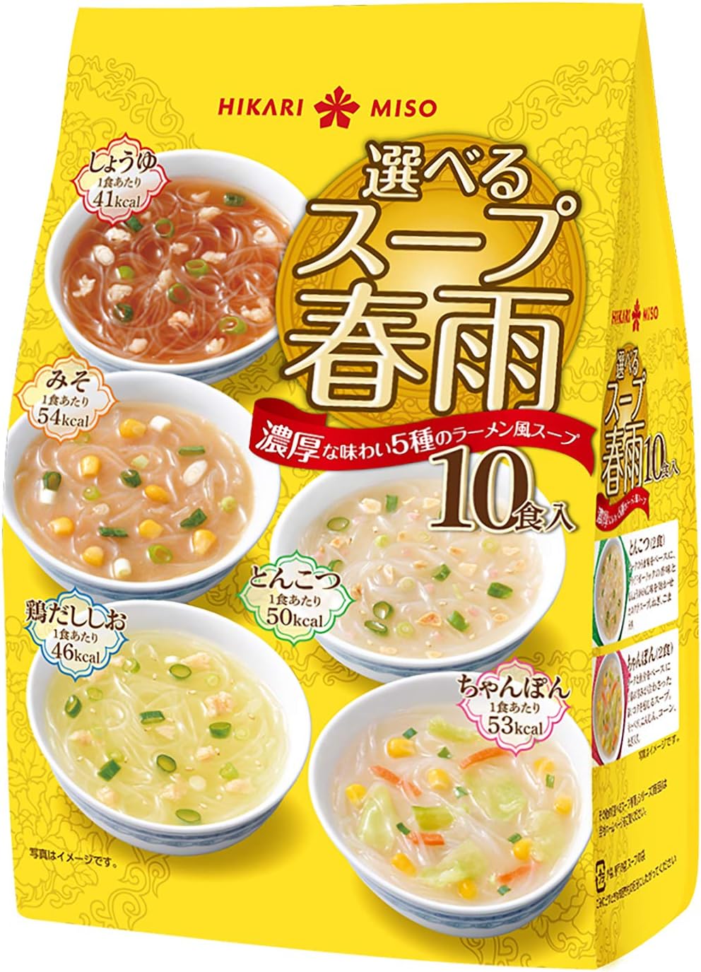 前回掲載時より値下がりしました。1食あたり31.4円。春雨でカロリーを抑えつつも、ラーメン風の濃厚な味わいで、満足感の高い春雨スープ5種のアソート。しょうゆは、チキンとポークをベースに野菜のうま味と香辛料を効かせた、シンプルかつ王道のスープ。みそは、ポークをベースにエビのうま味を加え、コク深い味わいに仕上げた、ひかり味噌こだわりのスープ。鶏だししおは、チキンをベースにポークと野菜のうま味、香辛料を効かせた、すっきりしながらもコク深いスープ。とんこつは、ポークのうま味をベースに、フライドガーリックの香味と紅しょうがの風味を効かせたコク旨スープ。ちゃんぽんは、ポークと魚介をベースに野菜の甘みが合わさった深いコクを感じるスープ。Amazonプライム会員又は2,000円以上の注文で送料無料。それ以外は送料400円です。