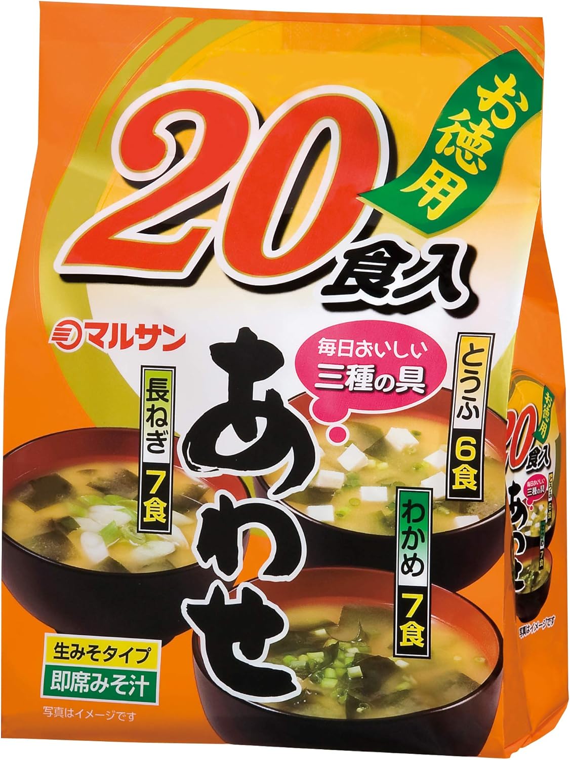 アウトレット特価!お湯を注ぐだけで、おいしいみそ汁が楽しめます。徳用20食の大袋タイプ。みそは、赤だしを使用しています。20食入り即席みそ汁を飽きないように3種類の具材(長ねぎ7食、わかめ7食、豆腐6食)でアソート化。Amazonプライム会員又は2,000円以上の注文で送料無料。それ以外は送料400円です。
