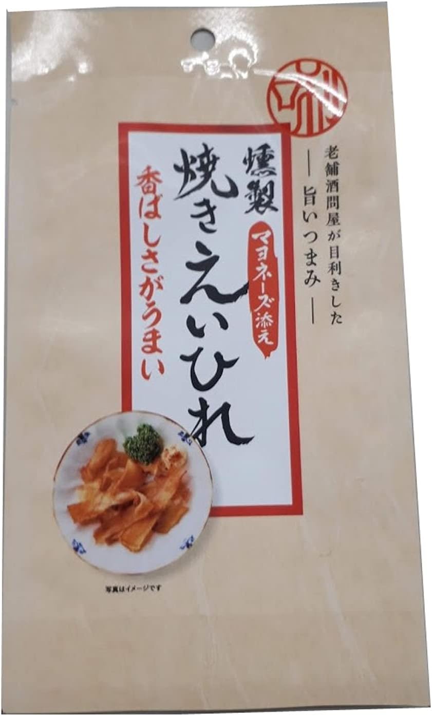 アウトレット特価!居酒屋の定番メニューである「焼きえいひれ」。居酒屋の臨場感を味わえるようマヨネーズを封入しています。食べ応えのある肉厚のえいひれを燻製し、香ばしく焼き上げてあり、お好みで一味・七味唐辛子等をかけても、軽く炙っても美味しく食べられる商品です。Amazonプライム会員又は2,000円以上の注文で送料無料。それ以外は送料400円です。