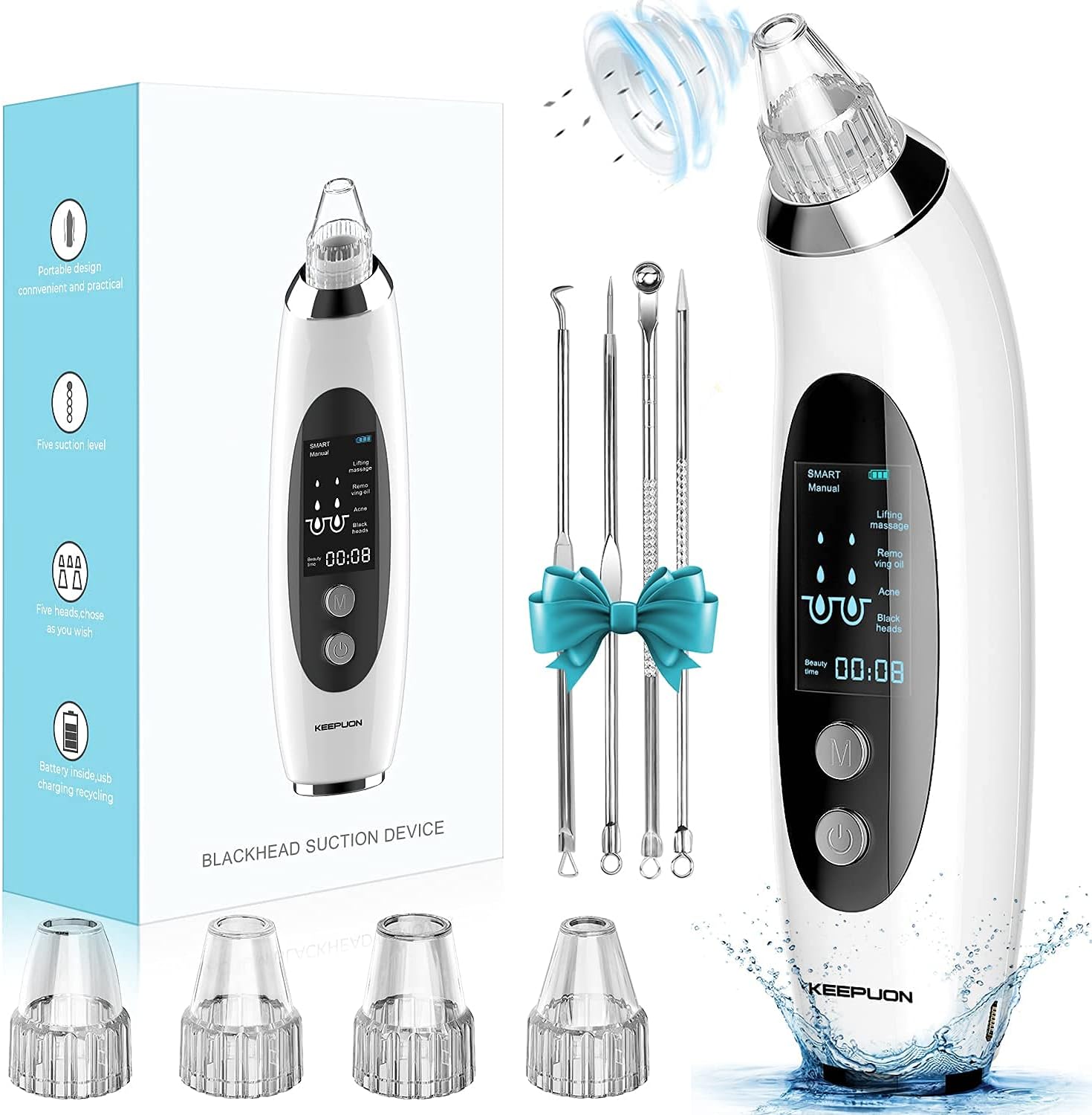 クーポンコード:FDHF4UBXで表記価格になります。最大吸引力は65kpで肌に激しい刺激を与えないように、肌質に合わせて吸引力の強弱を4段階調節、角栓・黒ずみ・ニキビを集中的にしっかり吸引できます。吸引力が強いほうが頑固な毛穴汚れを根元から吸引、自宅でもお気軽に毛穴汚れケアが可能です。1.93インチの高精細LCDスクリーンで操作モード、バッテリー状態、吸引レベル(4つの異なる吸引モード)、および作業時間が一目でわかります。4種類の交換ヘッドは付き。1000mAhの容量を持つ高品質のリチウム電池内蔵で、 3時間の充電で180分以上使用できます。12ヶ月保証。