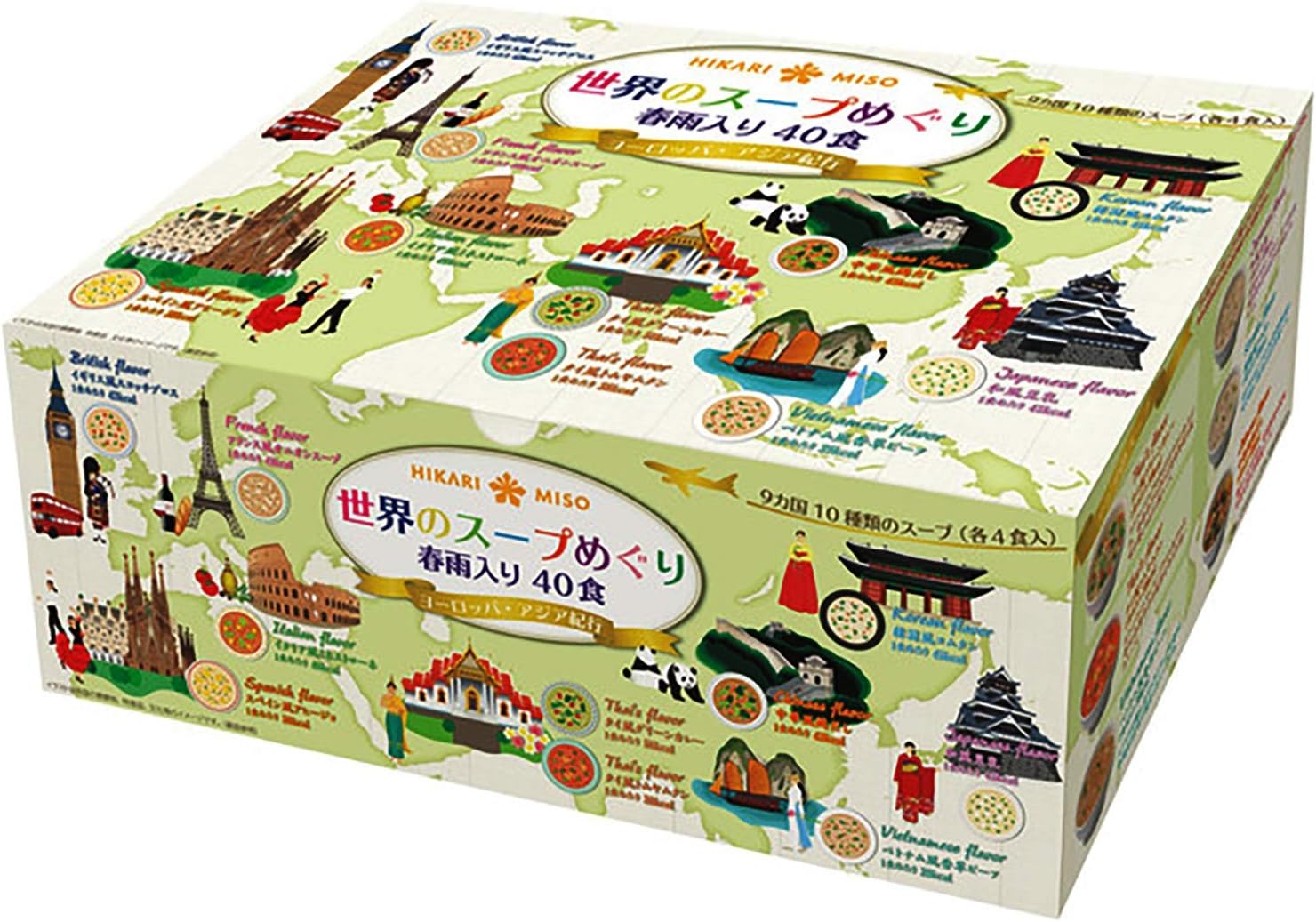 ちょっと楽しそうです。1食あたり37円。アジア~ヨーロッパの9カ国を代表する10種類のスープを味わう春雨スープのアソートセット。和風豆乳スープ・韓国風コムタン風スープ・中華風鶏だしスープ・ベトナム風香草ビーフスープ・タイ風グリーンカレースープ・タイ風トムヤムクンスープ・イタリア風ミネストローネ・フランス風オニオンスープ(チーズ風味)・スペイン風アヒージョ・イギリス風スコッチブロス(大麦と野菜のスープ)のアソート。Amazonプライム会員又は2,000円以上の注文で送料無料。それ以外は送料400円です。
