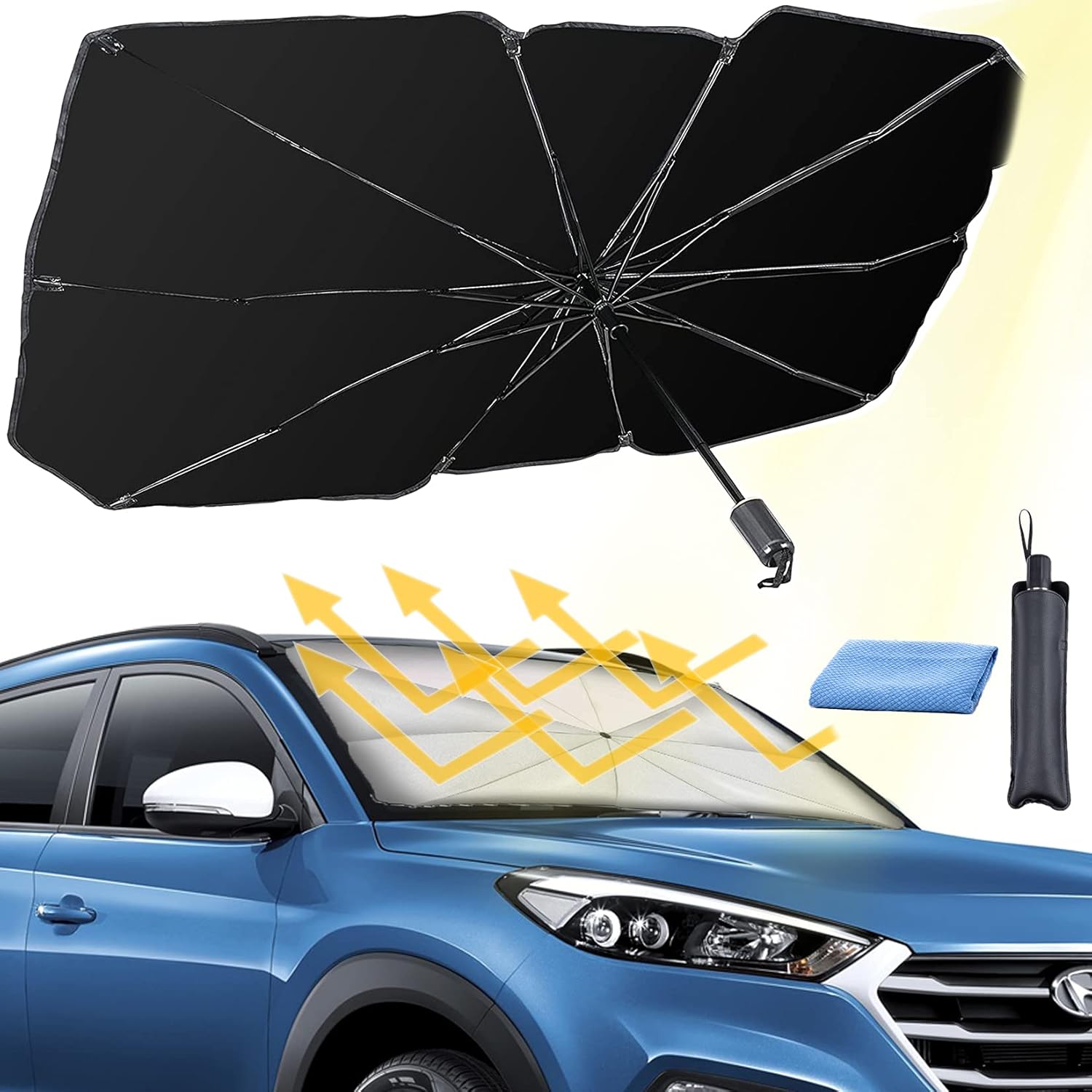 クーポンコード:V7HS6LKEで表記価格になります。99.5%の紫外線を効果的に遮断し、駐車時の大事な愛車を太陽光による損傷やハンドル焼け、ダッシュボードなどの樹脂部分の日焼けからしっかりと守ります。折りたたみ仕様で収納に便利です。頑丈な黒鋼骨製の10本傘骨を採用し優れた耐用性。屋外キャンプの日よけや突然の豪雨でも雨傘として使用できます。車中泊や仮眠時にもオススメです。Amazonプライム会員又は2,000円以上の注文で送料無料。それ以外は送料400円です。