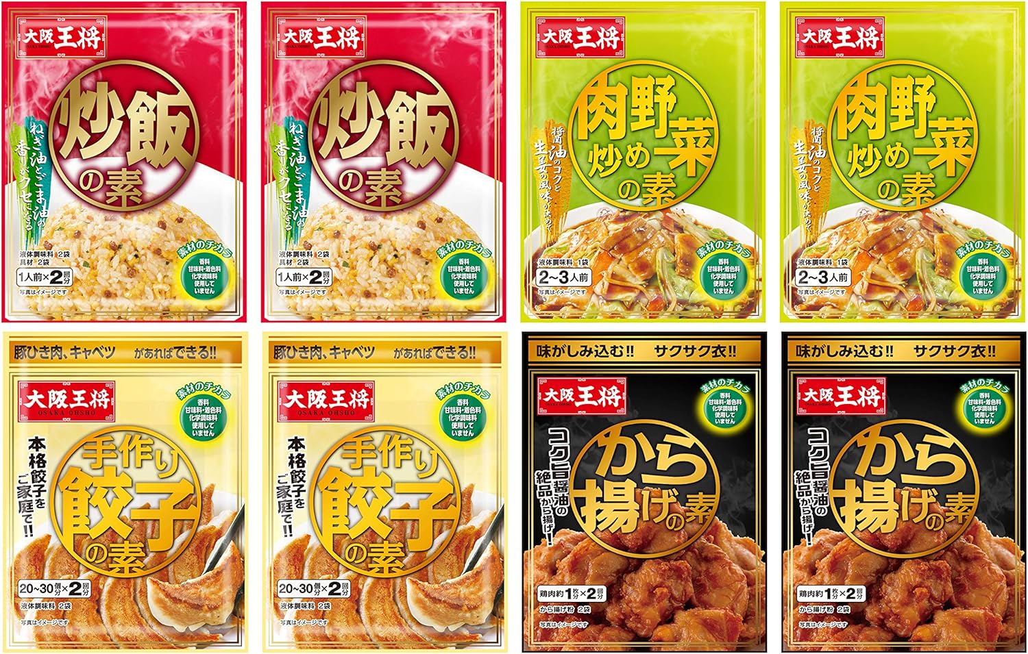 創業50年以上を誇る餃子専門店『大阪王将』の人気メニューがおうちで簡単に手作りできる料理の素シリーズのセット。人気の炒めもの商品を楽しめるお徳用です炒飯の素2個・手作り餃子の素2個・唐揚げの素2個・肉野菜炒めの素2個を詰め合わせて合計4種8袋と食べ応え抜群。Amazonプライム会員又は2,000円以上の注文で送料無料。それ以外は送料400円です。