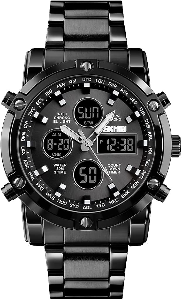 クーポンコード:5ZDKAJE3で表記価格になります。アラーム・ストップウォッチ・防水設計・LEDライト・12/24・カウントダウン・日付曜日表示。瞬時に時間を認識できるというアナログウォッチの視認性の高さと、アラームなどのデジタルウォッチの機能を併せ持つハイブリットモデル。