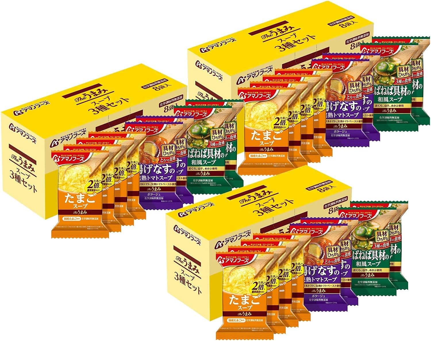 賞味期限間近、セット組詰め直し、外装不良(箱潰れ・開梱跡・シール跡など)があるのため訳あり特価。Theうまみスープ3種8食×3箱のセット。アマノフーズのフリーズドライスープはおいしいのでおすすめです。