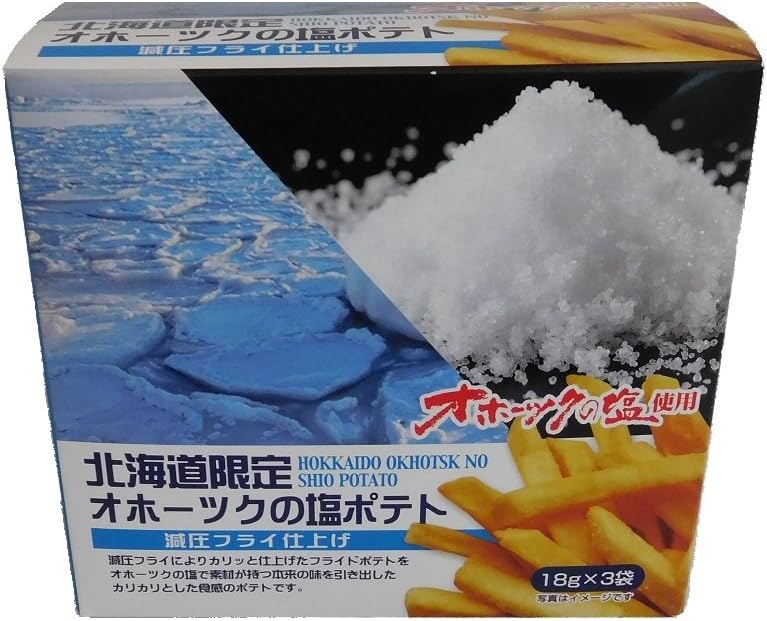 アウトレット特価!減圧フライ製法により、カリッと仕上げたフライドポテトを、北海道オホーツクの塩で素材が持つ本来の味を引き出したカリカリとした食感がクセになるポテト。北海道が溢れるデザインの化粧箱の中に食べやすい3袋入り。お菓子としてはもちろん、お酒のおつまみにも合うシンプルな美味しさは子供から大人まで抜群の人気。Amazonプライム会員又は2,000円以上の注文で送料無料。それ以外は送料400円です。