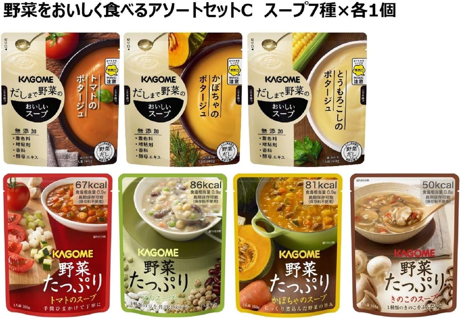半額クーポン復活しました。商品ページ内のクーポンで表記価格になります。だしまで野菜のおいしいスープ(とうもろこし・トマト・かぼちゃ)、野菜たっぷりスープ(トマト、かぼちゃ、豆、きのこ)のセット。野菜の会社カゴメが手間ひまかけて作り上げた「野菜だし」を使い、だしまで野菜にこだわることで、野菜本来のおいしさを最大限に引き出したポタージュです。コーンピューレをふんだんに使用した「とうもろこし」、ローズマリー、砂糖、野菜だしによりかぼちゃの青臭さを軽減した「かぼちゃ」、野菜だしと玉ねぎを加えることで酸味を控えめに調整した「トマト」の3種。レンジでそのまま温めて食べられる蒸気抜きパウチ入りです。「野菜たっぷりスープ」4品は、野菜素材をふんだんに使い、じっくり時間をかけて丁寧に仕上げたスープです。保存料不使用なのに、長期保存が可能(製造から5.5年)。ヴィーガン認定基準クリア商品。クーポンが消えている場合は終了していますのでご了承ください。