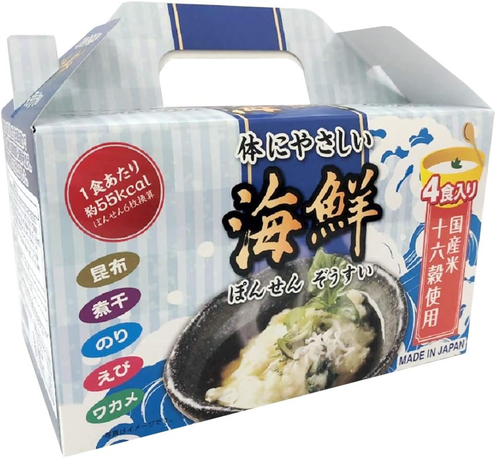 1食あたり49.5円。最低注文数が3個ですのでご注意下さい。国産雑穀を100%使用した海鮮雑穀ぞうすいです。白米1杯(約235kcal)に比べ、1食あたり約55kcalとヘルシー。国産穀物と5種の海鮮(昆布・煮干・のり・えび・わかめ)を焼き上げたぽんせん。香ばしく、ふんわりサクサクの海鮮ぽんせんとスープで簡単においしいぞうすいが楽しめます。お湯を注ぐだけで簡単に出来上がるので、忙しい朝や夜食にぴったり。少量でもおなかに満足感を得ることができるので、食べ過ぎてしまった日はご飯を雑穀ぞうすいに置きかえて、ヘルシーにできます。Amazonプライム会員又は2,000円以上の注文で送料無料。それ以外は送料400円です。