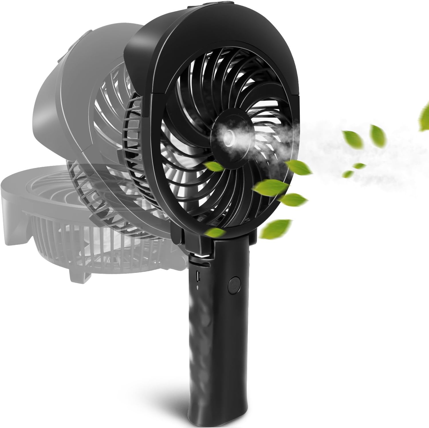 クーポンコード:777HCBV7で表記価格になります。6枚羽根があり、スイッチで風力が3段階切り替えできます。2000mAhバッテリー搭載で最大10時間連続使用可能。水槽は55mL収容でき、噴霧時間約2時間。手持ち、折りたんで卓上の2way。