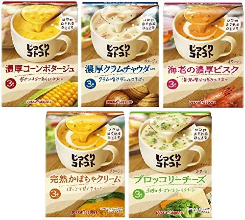 商品ページ内のクーポンで表記価格になります。濃厚コーン、濃厚クラムチャウダー、海老の濃厚ビスク、完熟かぼちゃクリーム、ブロッコリーチーズの5種アソートパック。濃厚コーンは素材本来の甘さを引き出し、特製クリームでクリーミーな口当たりに仕上げたコーンポタージュ。濃厚クラムチャウダーは場の北米のクラムチャウダーをイメージした、貝の濃厚な旨みとフィッシュブイヨンの魚介の旨みが溶け込んだ本格的なクラムチャウダー。海老の濃厚ビスクはたっぷりの海老を使用したぎゅっと旨みがつまった海老のだしと、じっくり炒めた玉ねぎや完熟トマトの旨みが一体となったビスク。完熟かぼちゃクリームは完熟栗かぼちゃを厳選し、かぼちゃ本来の甘みを引き出すようにひと手間かけた「じっくりコトコトオリジナルかぼちゃパウダー」を使用した、大人のひとときにぴったりの、ほっこり甘くクリーミーなポタージュ。ブロッコリーチーズはクリーミーなポタージュに、3種のチーズの旨みがとろ~り溶け込んだ、濃厚でちょっと贅沢なポタージュ。ブロッコリー具材が食感のアクセントになります。Amazonプライム会員又は2,000円以上の注文で送料無料。それ以外は送料400円です。