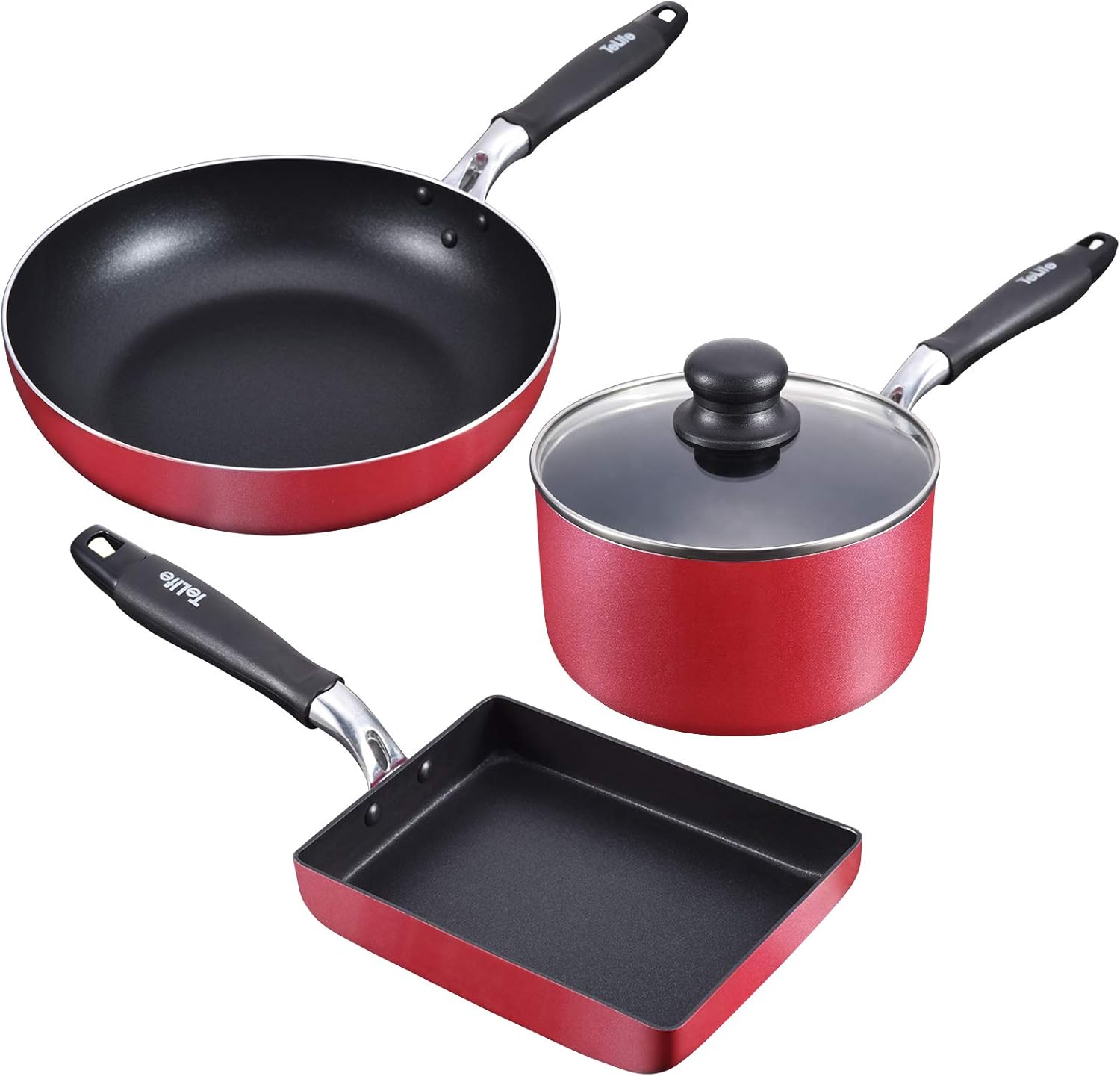 商品ページ内のクーポンで表記価格になります。フライパン26cm、鍋18cm、玉子焼き器13x18cmの3点セット。ガス火はもちろん、IHクッキングヒーターやハロゲンヒーターなどオール熱源に対応。中が見やすいガラス蓋。内面4層コーデイング、丈夫な特殊加工により、変形に強く金属ヘラも使える、汚れやコゲがこびりつくにくく、お手入れも簡単。耐摩耗試験30万回以上クリア。クーポンが消えている場合は終了していますのでご了承ください。