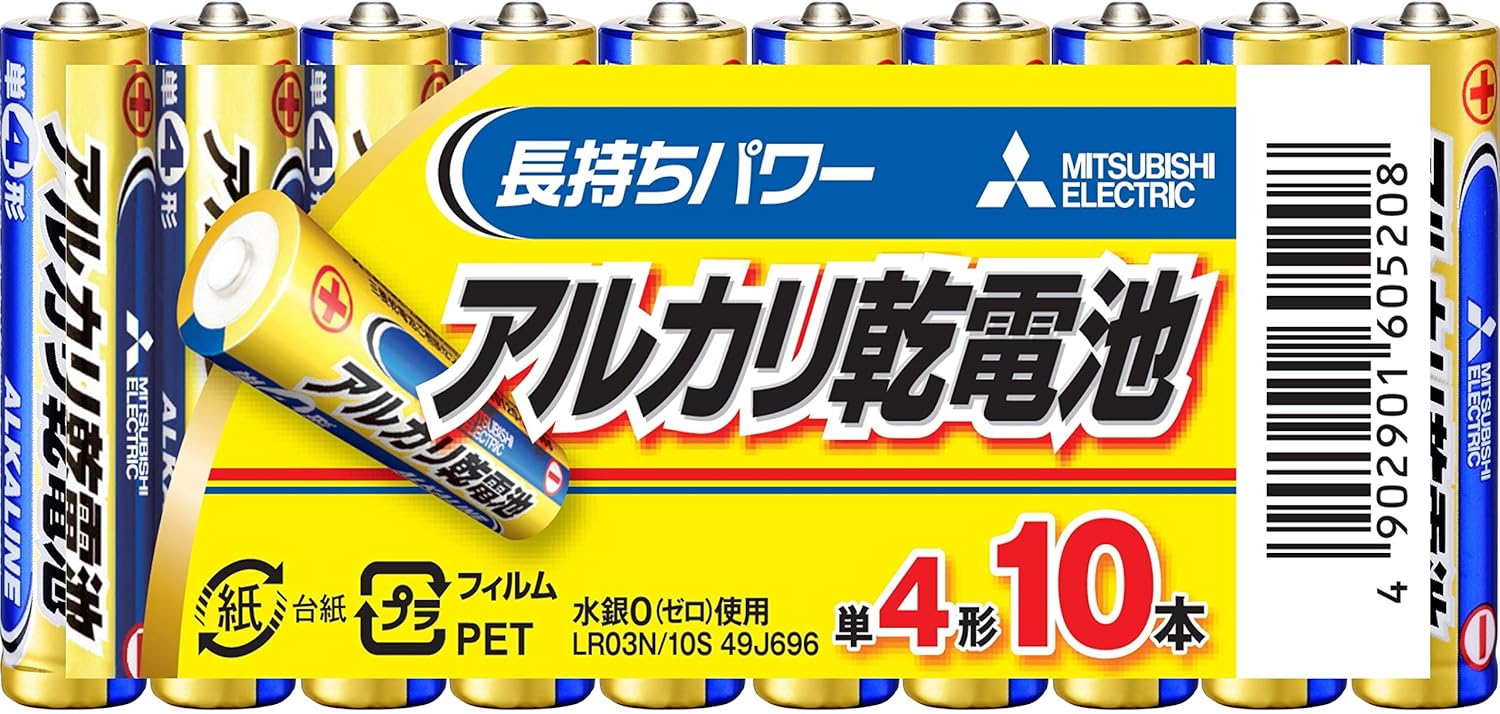 三菱電機の単4形アルカリ乾電池10本パック。1本あたり約33円ですので100均より若干高めですが、国産大手メーカーと考えればアリかと思います。Amazonプライム会員又は2,000円以上の注文で送料無料。それ以外は送料400円です。