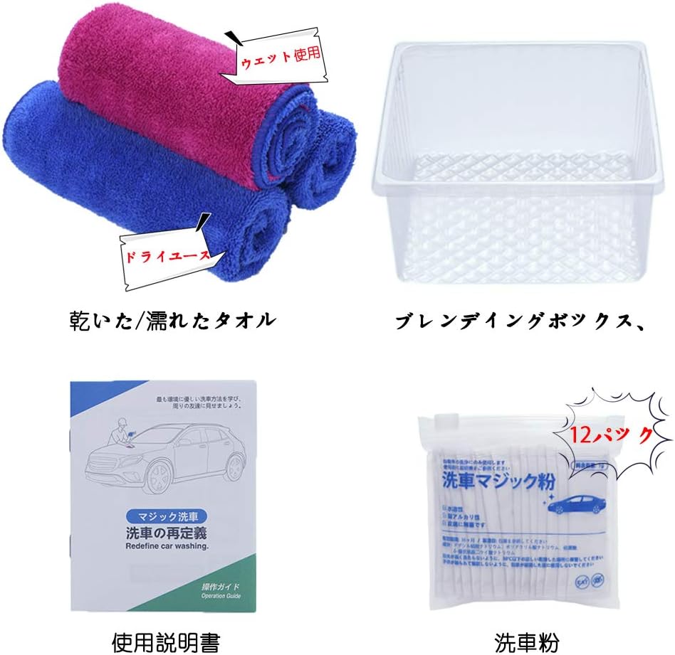 クーポンコード:LG4MK9DVで表記価格になります。洗車タオル3枚、洗車パウダー12パック、収納ボックス、説明書のセット。特許を取得した高分子添加剤の洗車マジックパウダーとの記載ですが性能はよくわかりません。