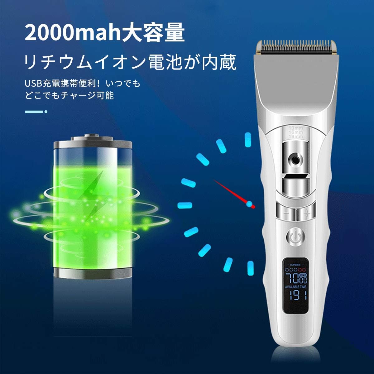 クーポンコード:YHM3X4L5で表記価格になります。LED液晶ディスプレイで、残りの使用可能時間を表示、低バッテリー提示、震動の頻度などの情報が液晶画面に表示されるため、一目でわかりやすく快適に使用できます。充電しやすいスタンド付き、充電台に差し込むだけでラクラク充電できます。刃の先端は良質なチタンとセラミックスで構成されて、カット性能が良く、R型取り刃のデザインがあり、頭皮を傷つけなくて安心にカットできます。耐久性に優れたセラミック刃を採用。2種類のアタッチメントを付け替え、本体のダイヤルと合わせて1-1.9mmの4段階の刈り高さが調節可能。
