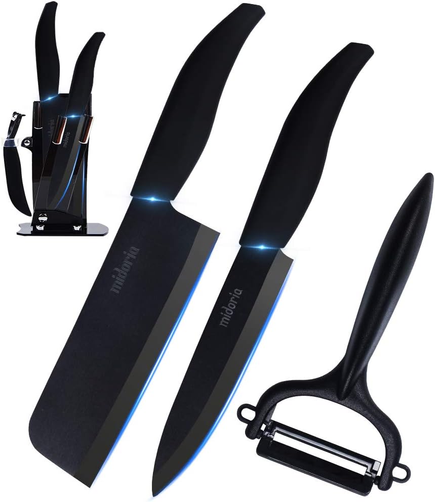 クーポンコード:E92LE37Lで表記価格になります。切れ味長持ち、軽い、さびない、お手入れ簡単のセラミック三徳ナイフ。ナイフ2種、ピーラー、包丁立てのお得な4点セットです。軽量さと鋭い切れ味が魅力。とても切れ味が良く、生の鶏肉、焼いた後の肉など、さくさくっと切れて料理のストレスが減ります。超軽量、調理しやすいです。さらに、金気がでないので、食材の変色や匂い移りがなく風味を100%活かします。