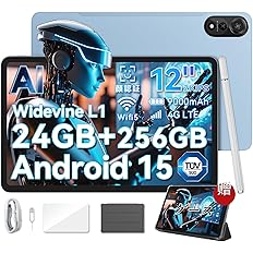 Android15搭載12インチタブレット。10.1インチタブレットの画面より62%大きく、178度の超広角視野、2000×1200の2K解像度。24GB(8GB+16GB拡張)の大容量メモリ搭載。Unisoc T615オクタコアプロセッサー、256GBの高速UFSストレージチップ搭載で最大2TBまでのマイクロSDカード(FAT32、exFAT、NTFS形式対応/別売り)によるストレージ拡張が可能。大容量9000mAhバッテリー。1600万画素のデュアルAIリアカメラと800万画素のフロントカメラ。PSE/技適認証取得済み。保護ケース付き。2年保証。