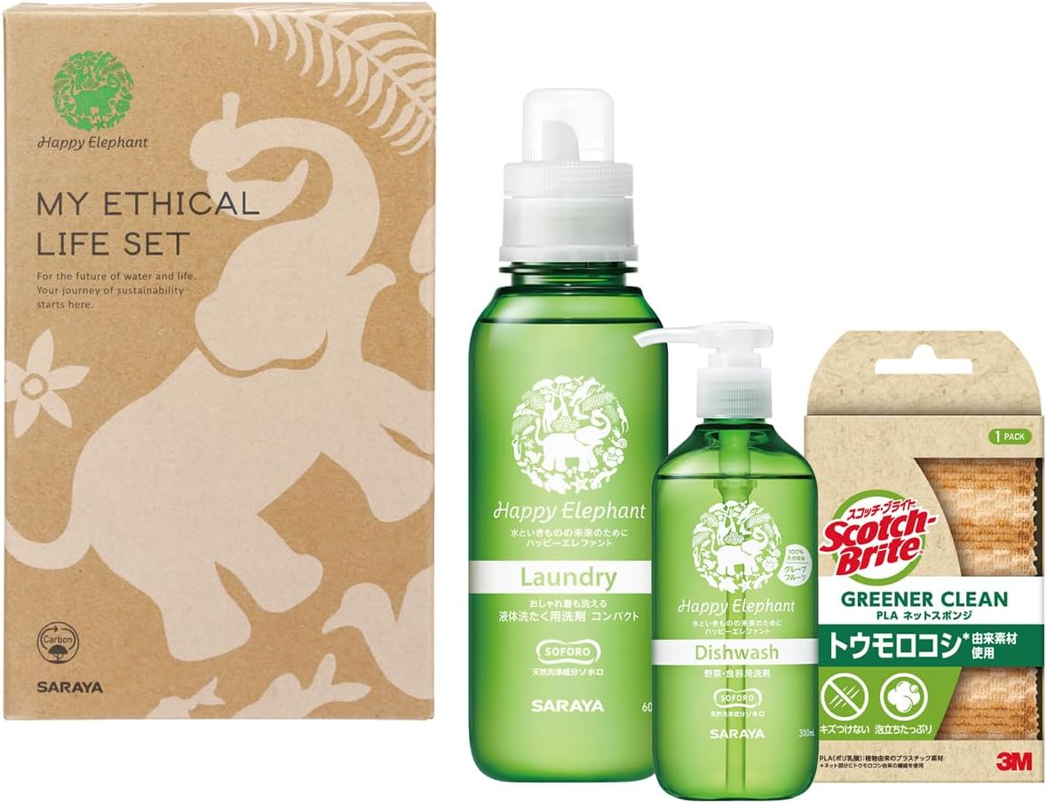 AmazonスマイルSale特価!商品ページ内のクーポンで表記価格になります。サラヤ ハッピーエレファントの洗たく洗剤+食器用洗剤+食器用スポンジのセット。おしゃれ着も洗たくできる液体洗たく洗剤と野菜・食器用洗剤にトウモトコシ由来素材のスコッチブライトスポンジがセットになっています。クーポンが使用できない場合は終了していますのでご了承ください。Amazonプライム会員又は3,500円以上の注文で送料無料。Amazonプライム会員ではない方で3,500円に満たない場合は、本州・四国は送料410円、北海道・九州・沖縄・離島は送料450円です。