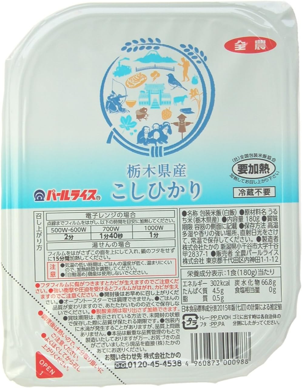 商品ページ内のクーポンで表記価格になります。1個あたり89円。定期おトク便なら更に割引になります。定期おトク便はいつでも解除できます。栃木県産コシヒカリ100%のパックごはんです。トレーに直接お米と水を入れて直炊きした、完全無菌の安心製法です。高圧力で一気に加熱することで、ごはんの甘さ、つや、粘りを引き出しています。安心、安全のため原料は産地銘柄を指定(栃木県産コシヒカリ100%)。玄米のまま工場へ入荷し、精米~炊飯~パック完了までを短時間(約4時間)で行っています。電子レンジで2分加熱(500W・600W)するだけで、ふっくらごはんができあがります。簡単、お手軽においしいごはんが食べられます。