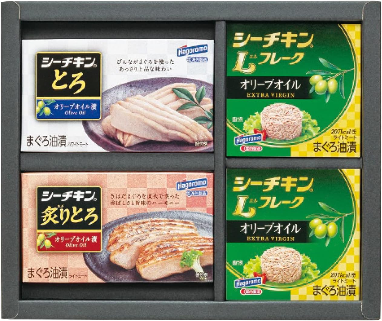 42%OFF!はごろものシーチキンの最上級品のギフトセットです。シーチキンとろ(びんなが)オリーブオイル漬・シーチキン炙りとろ(きはだ)オリーブオイル漬各1缶・各75g・シーチキンLフレークオリーブオイル70g×2缶のセット。Amazonプライム会員又は2,000円以上の注文で送料無料。それ以外は送料400円です。