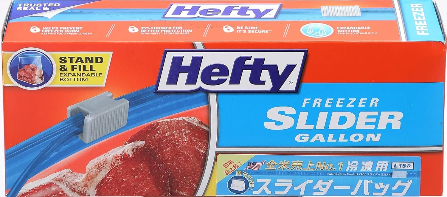 46%OFF!つまみを動かすだけでカンタン開け閉めが出来るスライド式ジッパーを採用! 使いたい分だけ出す時や、繰り返し開け閉めする食材や雑貨を入れるのに特に便利です。マチを広げて立てられるので、注いで入れる時こぼしにくい。収納する時も立てておけるからスッキリ整理出来て取り出しやすい。Lサイズ約23.6cm×約26.8cm×マチ6.9cm、15枚入り。入る量の目安は3000ml程度(8分目)です。冷凍用に適した丈夫な厚手(0.06mm)仕様。食品を酸化や乾燥から守り、新鮮に保ちます。全米売上No.1レイノルズ社製のHefty(ヘフティ)ブランドのマチ付きスライダーバッグです。Amazonプライム会員又は2,000円以上の注文で送料無料。それ以外は送料400円です。