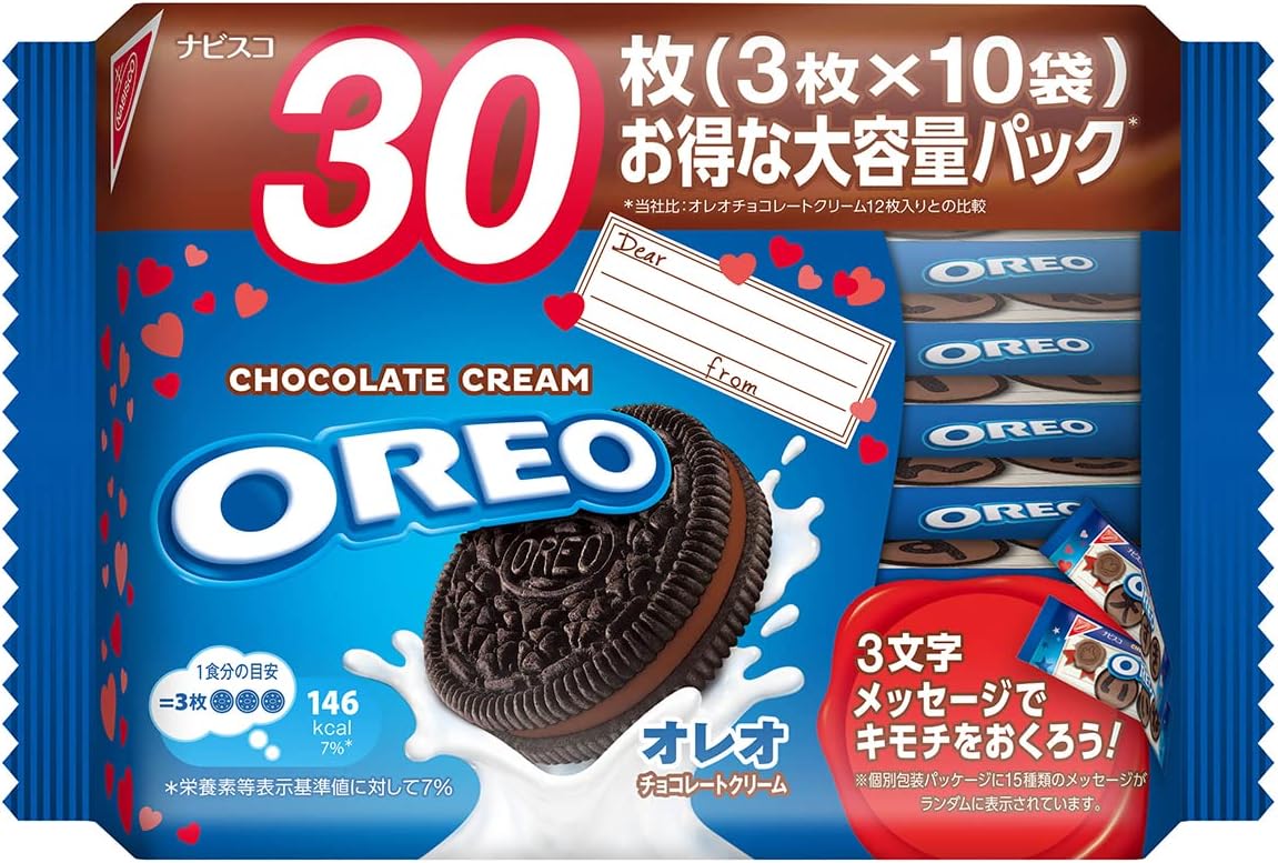 1袋(3枚)あたり20円。オレオのメッセージ入りの限定パッケージ。一度に食べるのに丁度よい3枚入りの個包装。個包装の横長デザイン活かした3文字で伝わるメッセージをオレオアート風デザインで表現したスペシャルパッケージ。個包装のデザインは全部で15種類。
