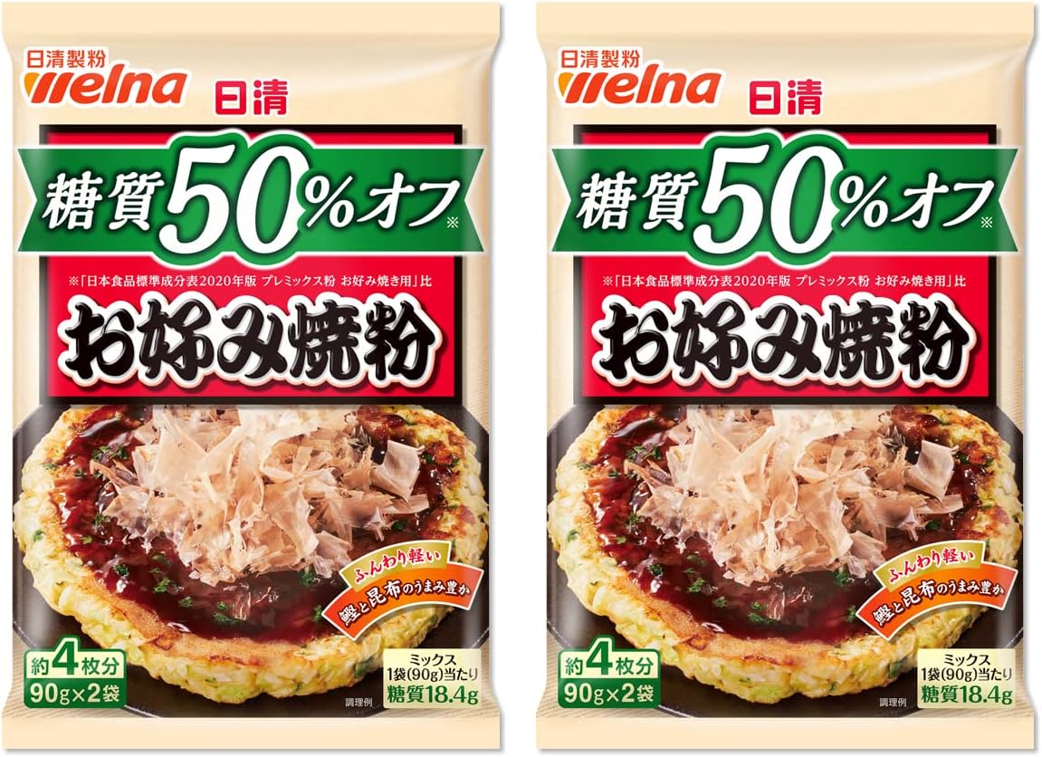 Amazonゴールデンウイークセール特価!定期おトク便なら更に割引になります。定期おトク便はいつでも解除できます。「糖質接取」に気を使う方向けのお好み焼き粉です。小麦粉の配合量を減らして、食物繊維をたっぷり配合することで糖質を低減しています。お好み焼き粉の仕上がりで求められる、ふんわり軽い食感を実現し、鰹と昆布の旨味豊かな味わいを楽しめる設計となっています。ミックス1袋(90g)当り糖質18.4g 1袋で2枚分となっています。2袋入り。Amazonプライム会員又は2,000円以上の注文で送料無料。それ以外は送料400円です。