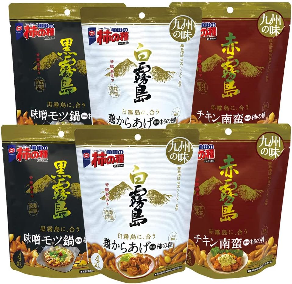 商品ページ内のクーポンで表記価格になります。霧島焼酎に合う亀田の柿の種詰め合わせです。白霧島に合う醤油とにんにくで後引くおいしさの鶏からあげ風味・赤霧島に合う甘酢とタルタル風味でまろやかなチキン南蛮風味・黒霧島に合うピリ辛味噌とにんにくで豊かな味わいの味噌モツ鍋風味の各2袋セット。クーポンが使用できない場合は終了していますのでご了承ください。