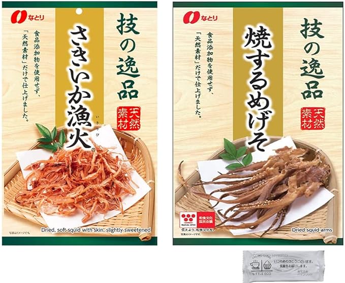 なとり 技の逸品さきいか漁火は、食品添加物を使用せず、天然素材だけで仕上げています。するめいかの胴の部分を味付けし、皮付きのまま香ばしく焼き上げています。噛めば噛むほどいか本来の旨味を味わえる逸品です。日本酒や焼酎などの和酒は勿論、ビール、チューハイやハイボールなどともよく合います。なとり 技の逸品 焼するめ げそは、食品添加物を使用せず、「天然素材」だけで仕上げています。国産するめいかのげそを干してさっと焼き上げています。噛むほどに広がる素材の旨みと、香ばしい香りが楽しめます。Amazonプライム会員又は2,000円以上の注文で送料無料。それ以外は送料400円です。